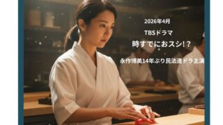 ドラマ 永作博美14年ぶり主演!ドラマ『時すでにオスシ!?』あらすじ・キャスト・脚本家まで徹底調査 永作博美14年ぶり主演ドラマ『時すでにオスシ!?』を徹底解説!50歳から寿司職人を目指すあらすじや、脚本家・兵藤るりの泣ける見どころ、気になるロケ地(鮨アカデミー)の予想まで。人生の再出発に勇気をくれる最新情報をチェックして、4月の放送に備えましょう! 2026.02.04 ドラマ